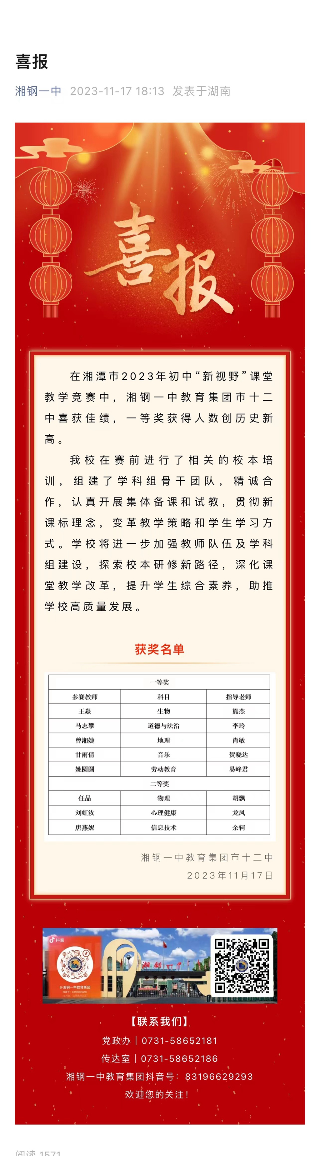 喜報:湘潭市2023年初中“新視野”課堂教學(xué)競賽