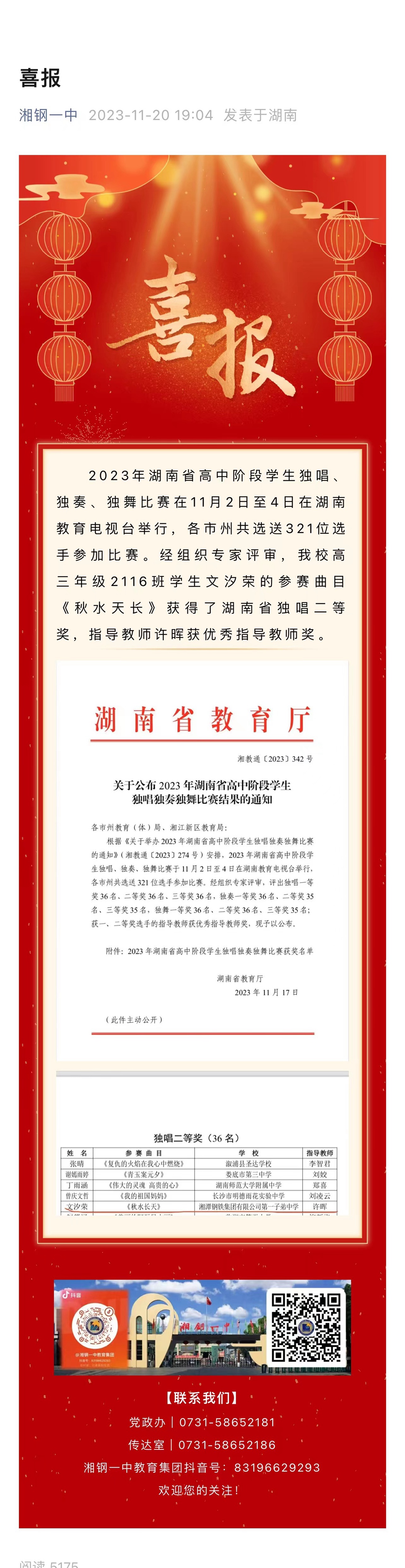 喜報(bào):2023年湖南省高中階段學(xué)生獨(dú)唱、獨(dú)奏、獨(dú)舞比賽我校高三年級(jí)2116班學(xué)生文汐榮的參賽曲目《秋水天長》獲得了湖南省獨(dú)唱二等獎(jiǎng),指導(dǎo)教師許暉獲優(yōu)秀指導(dǎo)教師獎(jiǎng)。