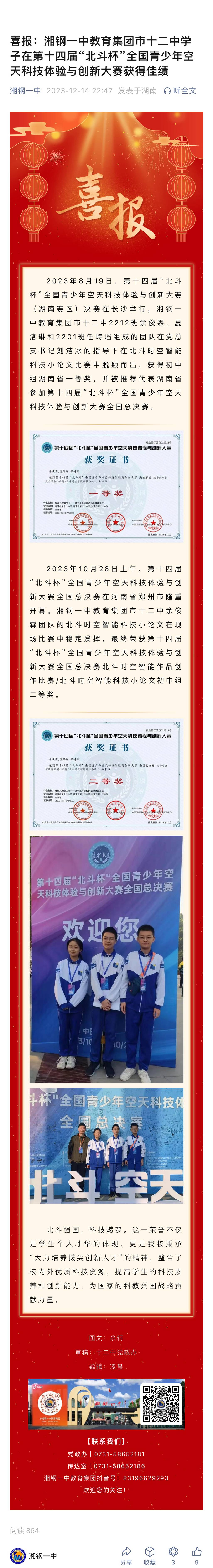 喜報(bào):第十四屆“北斗杯”全國(guó)青少年空天科技體驗(yàn)與創(chuàng)新大賽(湖南賽區(qū))決賽在長(zhǎng)沙舉行,湘鋼一中教育集團(tuán)市十二中2212班余俊霖、夏洛琳和2201班任峙滔組成的團(tuán)隊(duì)獲得初中組湖南省一等獎(jiǎng),并被推薦代表湖南省參加第十四屆“北斗杯”全國(guó)青少年空天科技體驗(yàn)與創(chuàng)新大賽全國(guó)總決賽。