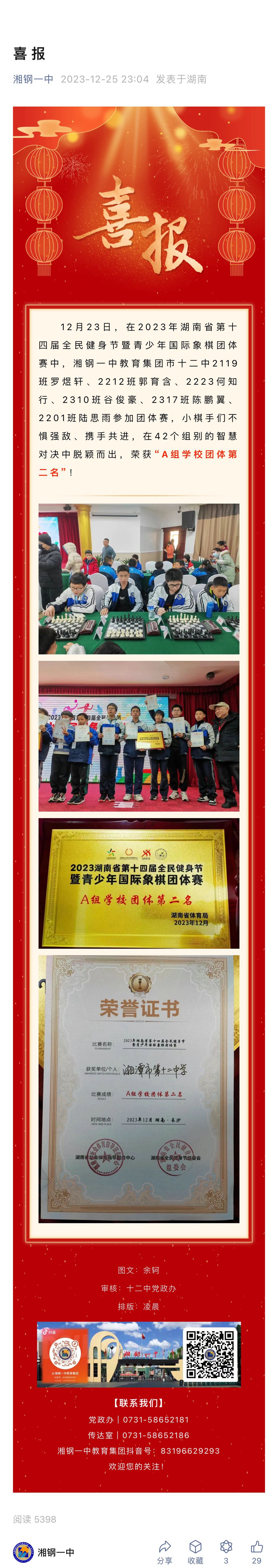 喜報:在2023年湖南省第十四屆全民健身節(jié)暨青少年國際象棋團體賽中,湘鋼一中教育集團市十二中2119班羅煜軒、2212班郭育含、2223何知行、2310班谷俊豪、2317班陳鵬翼、2201班陸思雨參加團體賽,榮獲“A組學校團體第二名”!