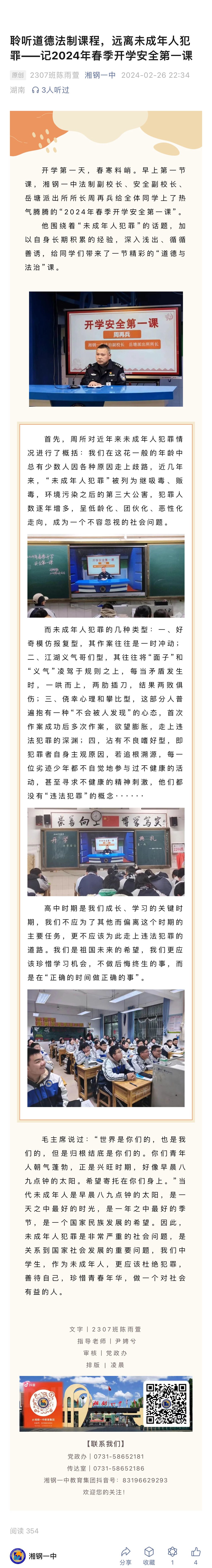 聆聽道德法制課程,遠(yuǎn)離未成年人犯罪——記2024年春季開學(xué)安全第一課