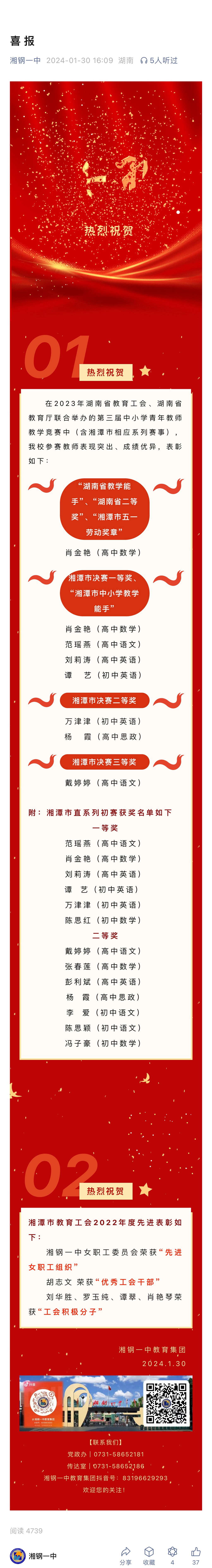 喜報:在2023年湖南省教育工會、湖南省教育廳聯(lián)合舉辦的第三屆中小學青年教師教學競賽中(含湘潭市相應系列賽事),我校參賽教師表現(xiàn)突出、成績優(yōu)異