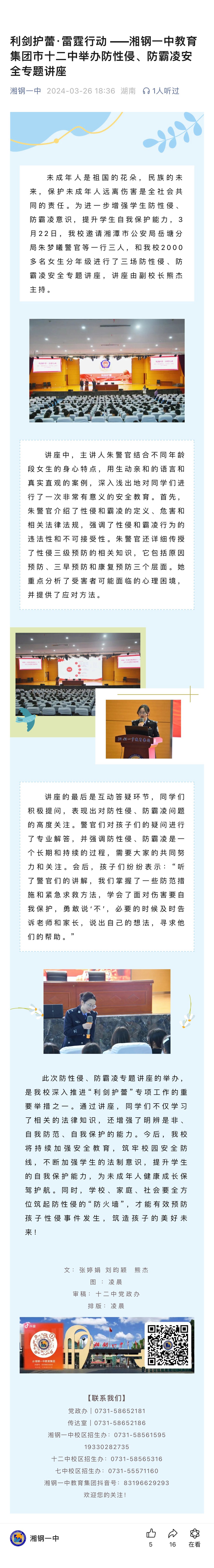 利劍護蕾·雷霆行動 ——湘鋼一中教育集團市十二中舉辦防性侵、防霸凌安全專題講座