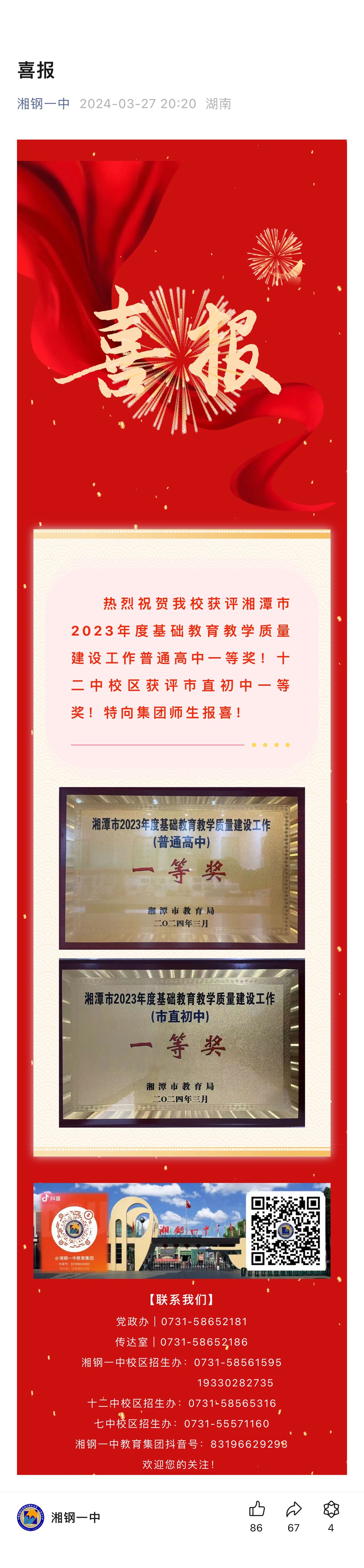 喜報:我校獲評湘潭市2023年度基礎(chǔ)教育教學(xué)質(zhì)量建設(shè)工作普通高中一等獎!十二中校區(qū)獲評市直初中一等獎!