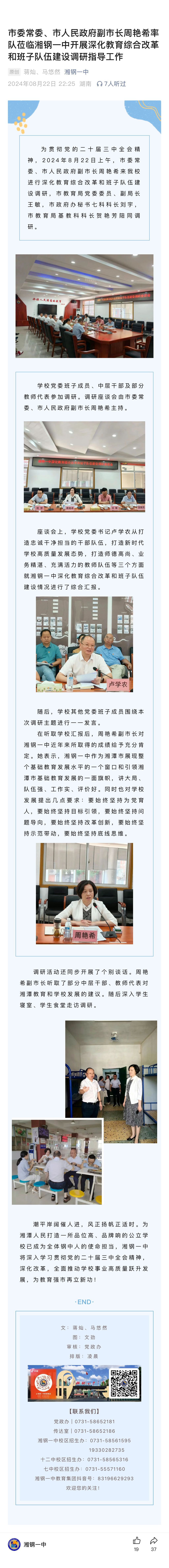 市委常委、市人民政府副市長周艷希率隊蒞臨湘鋼一中開展深化教育綜合改革和班子隊伍建設(shè)調(diào)研指導(dǎo)工作