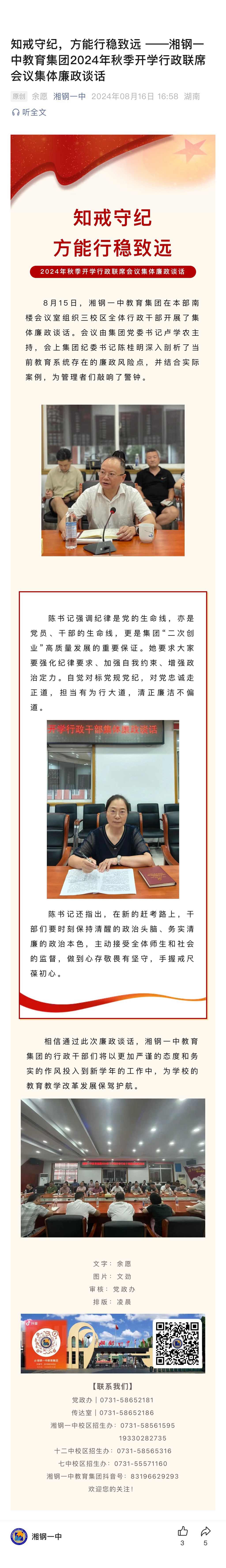 知戒守紀(jì),方能行穩(wěn)致遠(yuǎn) ——湘鋼一中教育集團(tuán)2024年秋季開學(xué)行政聯(lián)席會(huì)議集體廉政談話
