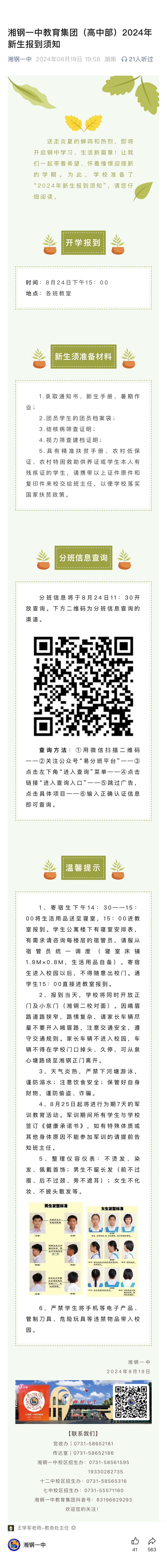 湘鋼一中教育集團(高中部)2024年新生報到須知