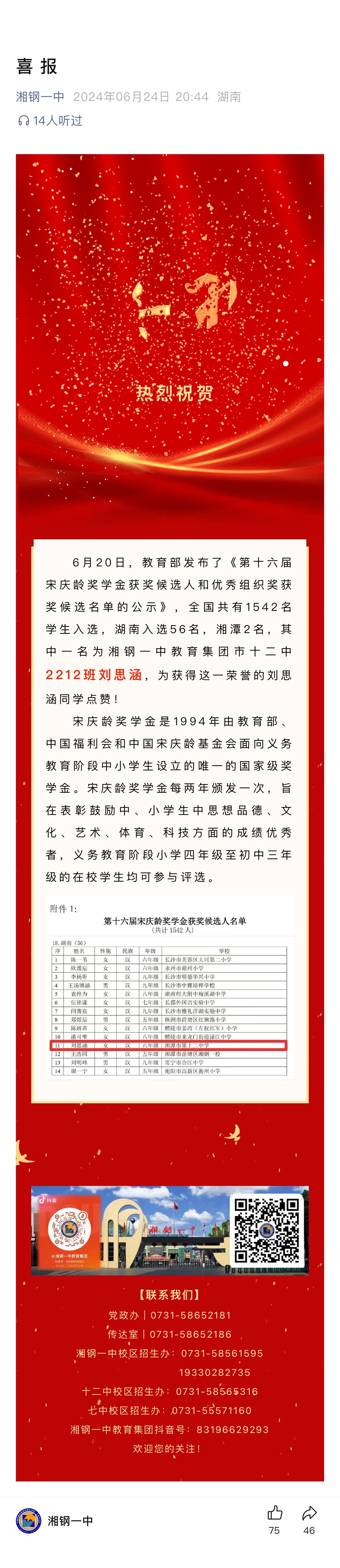 喜報(bào):市十二中2212班劉思涵入選第十六屆宋慶齡獎(jiǎng)學(xué)金獲獎(jiǎng)候選人