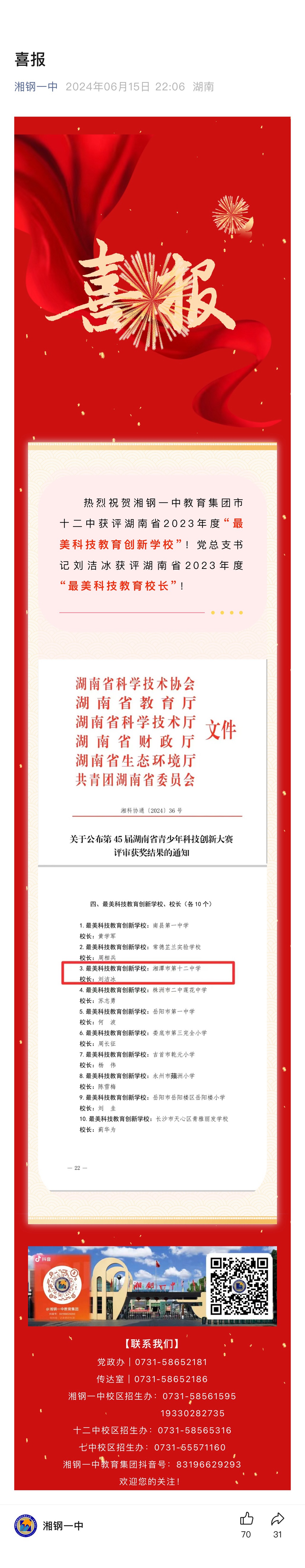 喜報:集團市十二中獲評湖南省2023年度“最美科技教育創(chuàng)新學?!?!黨總支書記劉潔冰獲評湖南省2023年度“最美科技教育校長”!