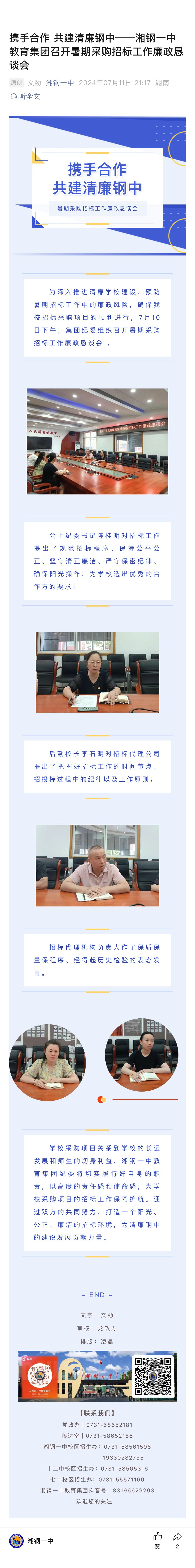 攜手合作 共建清廉鋼中——湘鋼一中教育集團召開暑期采購招標(biāo)工作廉政懇談會