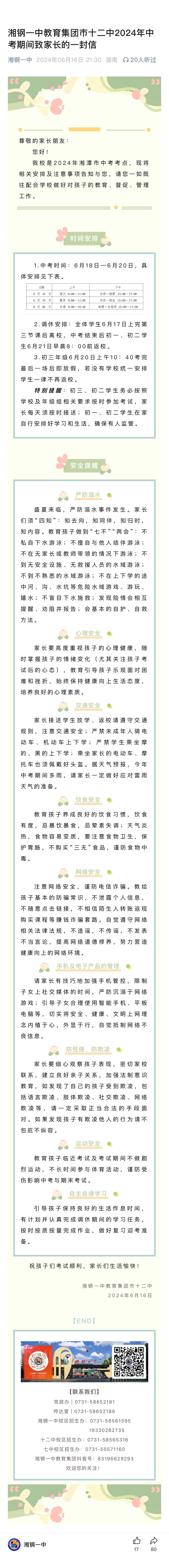 湘鋼一中教育集團市十二中2024年中考期間致家長的一封信
