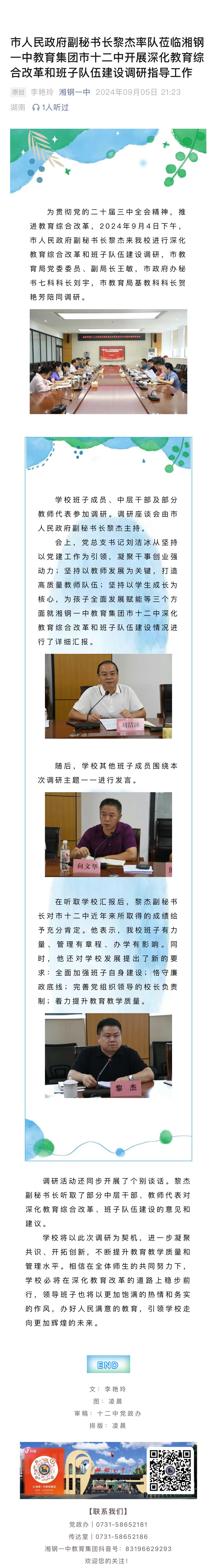 市人民政府副秘書(shū)長(zhǎng)黎杰率隊(duì)蒞臨湘鋼一中教育集團(tuán)市十二中開(kāi)展深化教育綜合改革和班子隊(duì)伍建設(shè)調(diào)研指導(dǎo)工作
