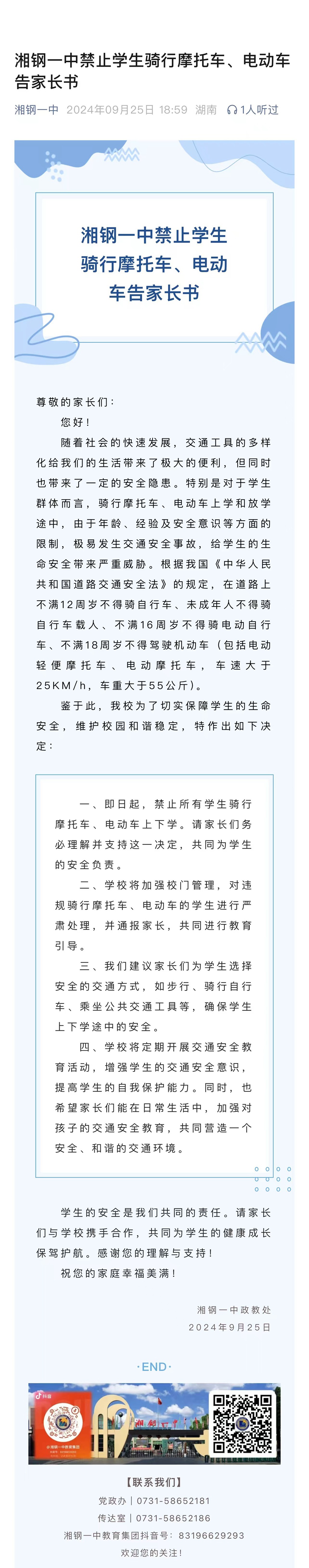 湘鋼一中禁止學(xué)生騎行摩托車、電動(dòng)車告家長書