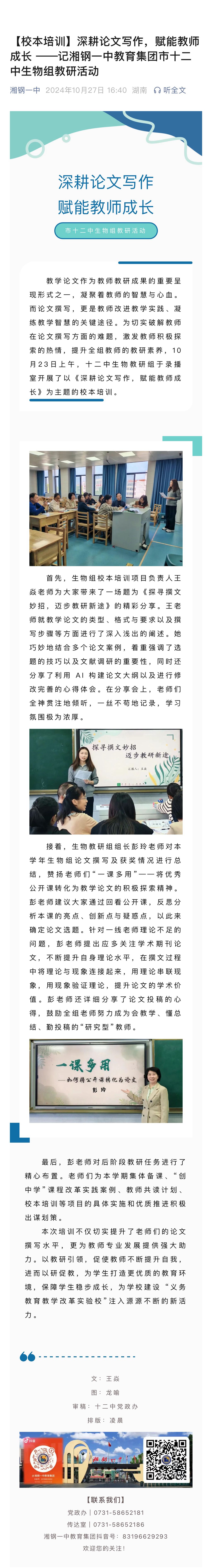 【校本培訓】深耕論文寫作,賦能教師成長 ——記湘鋼一中教育集團市十二中生物組教研活動