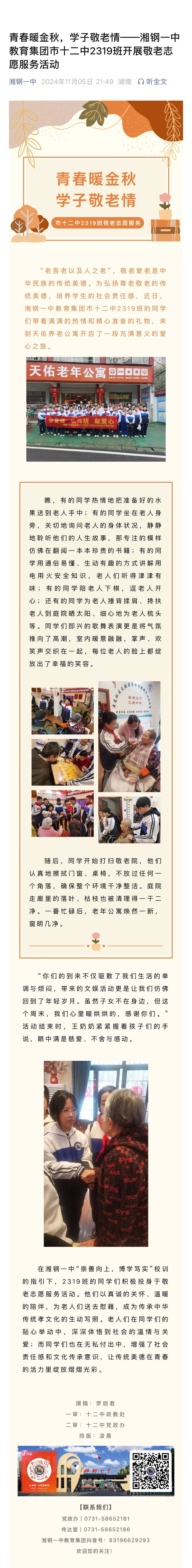 青春暖金秋,學(xué)子敬老情——湘鋼一中教育集團(tuán)市十二中2319班開展敬老志愿服務(wù)活動(dòng)