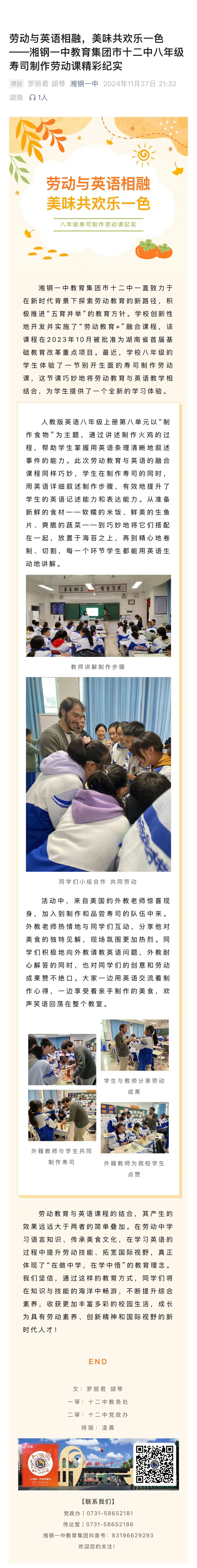 勞動(dòng)與英語相融,美味共歡樂一色 ——湘鋼一中教育集團(tuán)市十二中八年級壽司制作勞動(dòng)課精彩紀(jì)實(shí)