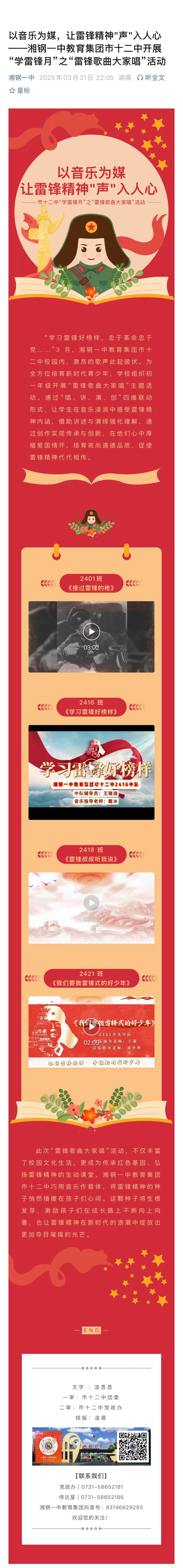 以音樂為媒,讓雷鋒精神"聲"入人心 ——湘鋼一中教育集團(tuán)市十二中開展“學(xué)雷鋒月”之“雷鋒歌曲大家唱”活動(dòng)