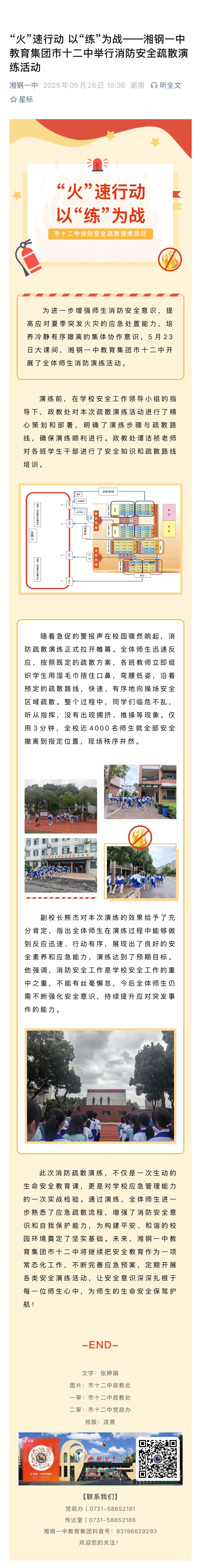 “火”速行動 以“練”為戰(zhàn)——湘鋼一中教育集團(tuán)市十二中舉行消防安全疏散演練活動